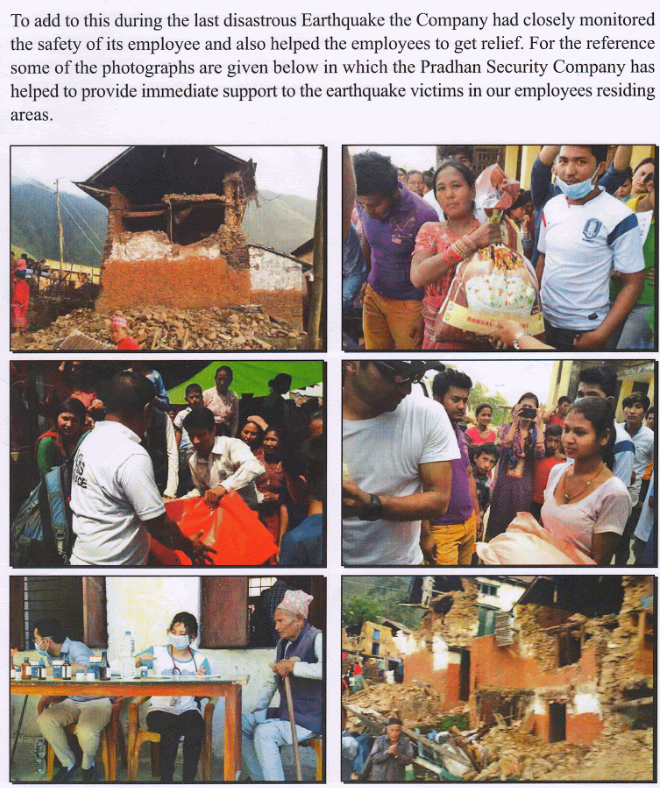The add to this during the last disastrous earthquake the company had closely monitored the safety of it's employees and also helped the employees and also get relief . For the reference some of the photographs are below in which the Pradhan security company has help to provide immediate support to the earthquake victims in our employees residing area ....